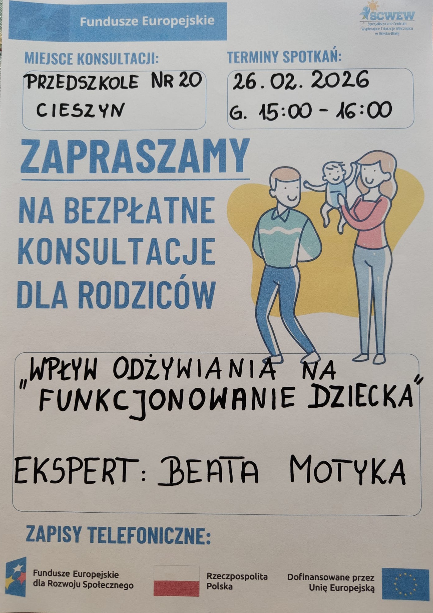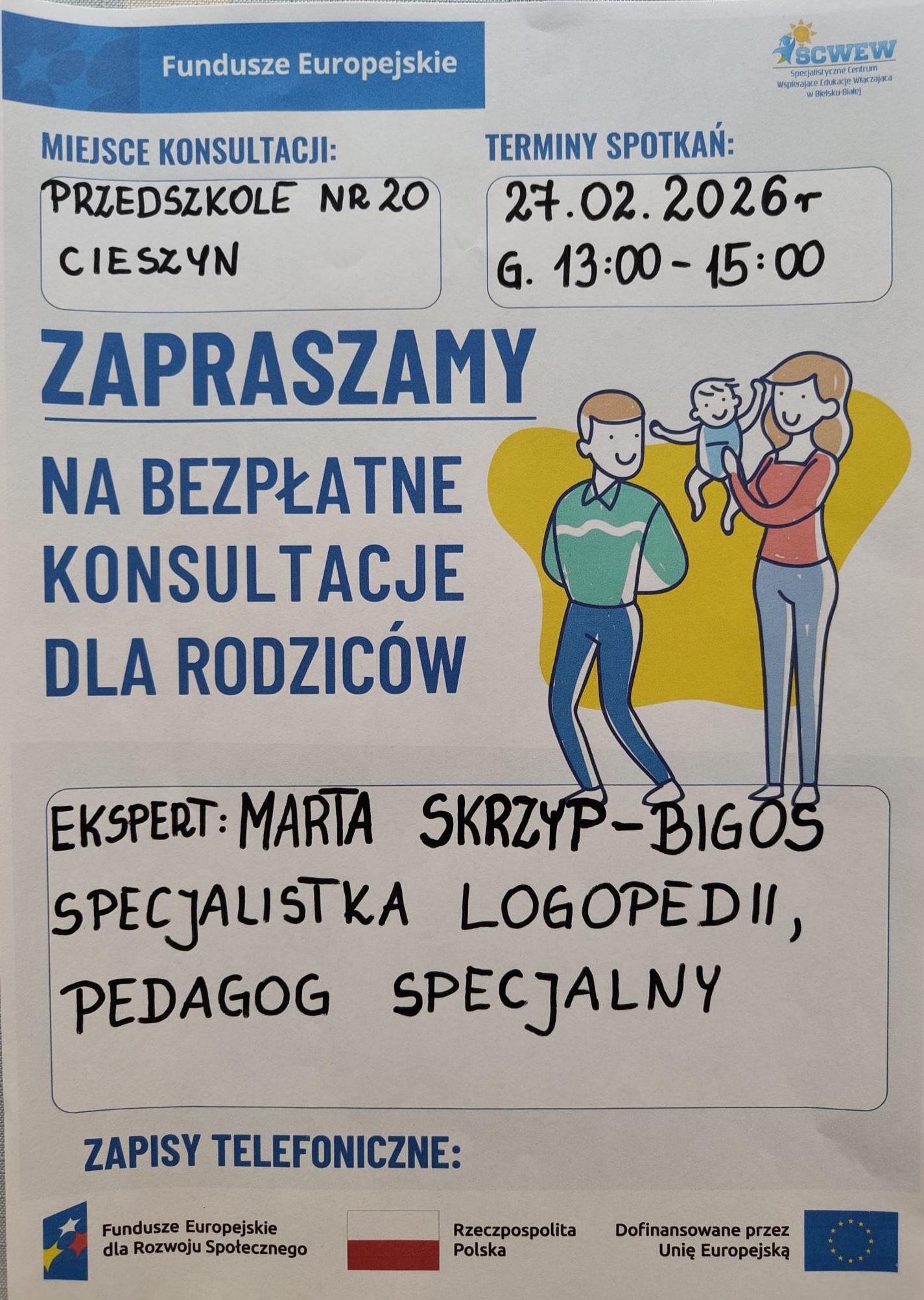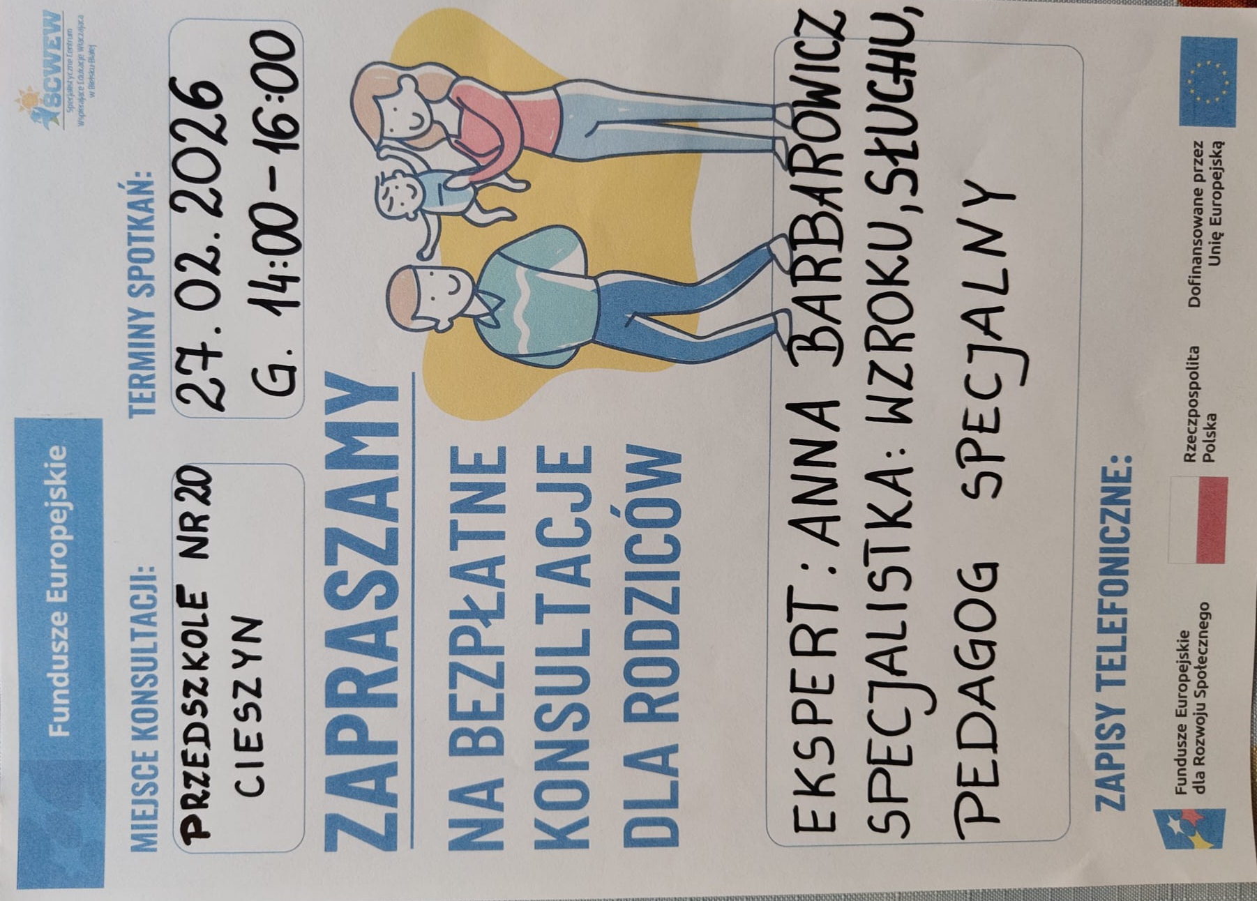 W ramach projektu unijnego zapraszamy rodziców na indywidualne konsultacje wraz z dzieckiem z przybyłymi specjalistami.